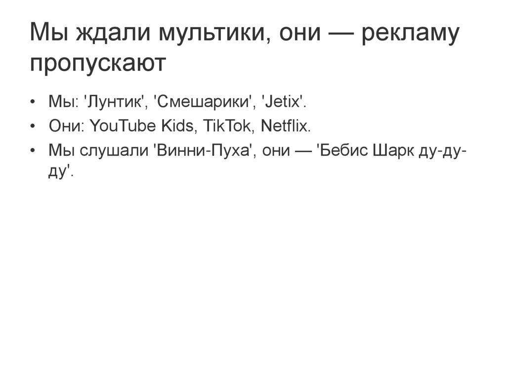 • Мы слушали 'Винни-Пуха', они — 'Бебис Шарк ду-дуду'.