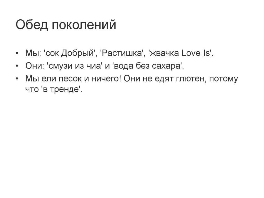 Обед поколений• Мы: 'сок Добрый', 'Растишка', 'жвачка Love Is'.