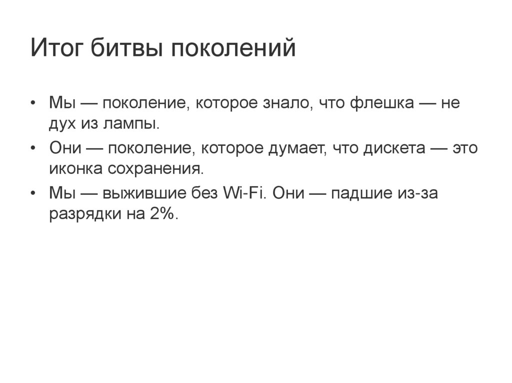 Итог битвы поколений• Мы — поколение, которое знало, что флешка — не