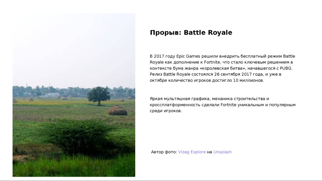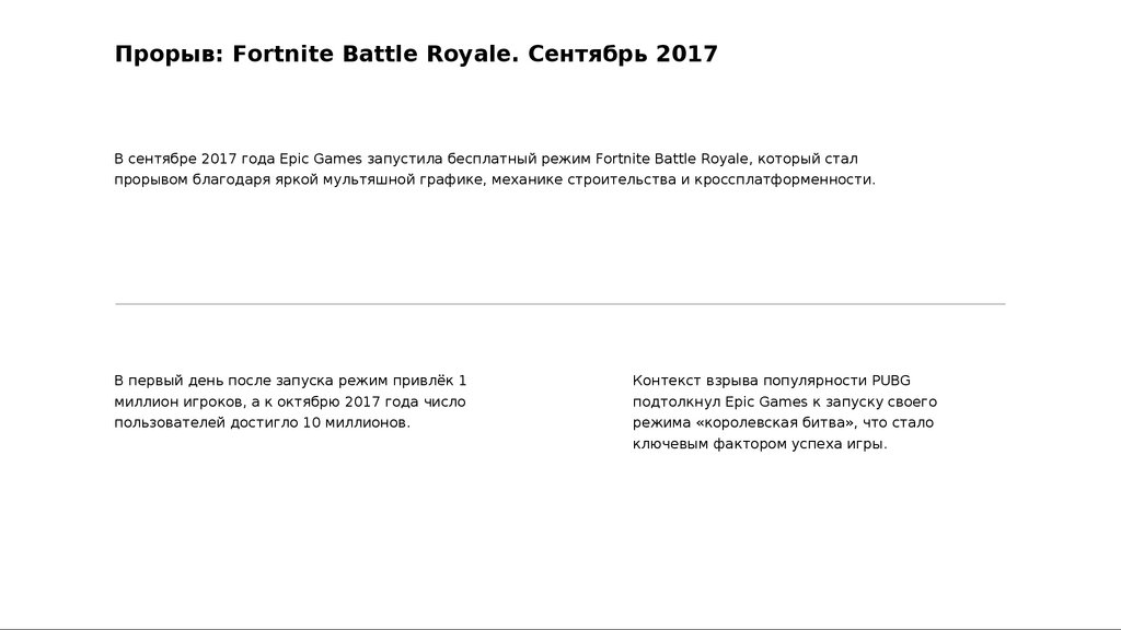 Прорыв: Fortnite Battle Royale. Сентябрь 2017В сентябре 2017 года Epic Games запустила бесплатный режим Fortnite Battle Royale, который стал
