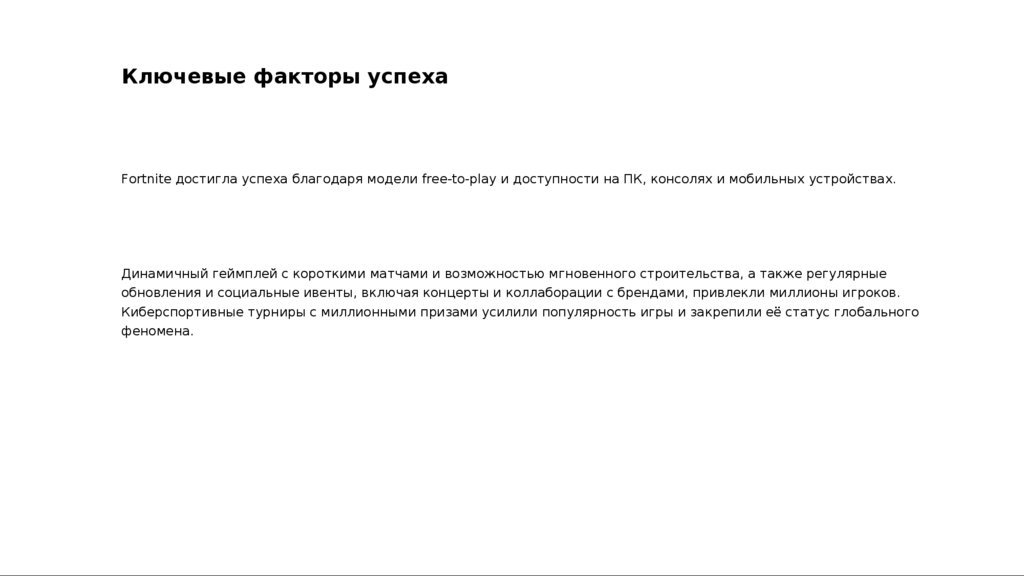 Ключевые факторы успехаFortnite достигла успеха благодаря модели free-to-play и доступности на ПК, консолях и мобильных устройствах.