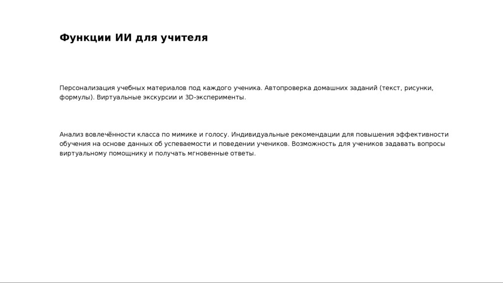 Функции ИИ для учителяПерсонализация учебных материалов под каждого ученика. Автопроверка домашних заданий (текст, рисунки,