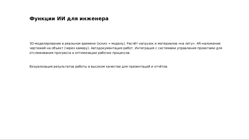 Функции ИИ для инженера3D‑моделирование в реальном времени (эскиз → модель). Расчёт нагрузок и материалов «на лету». AR‑наложение