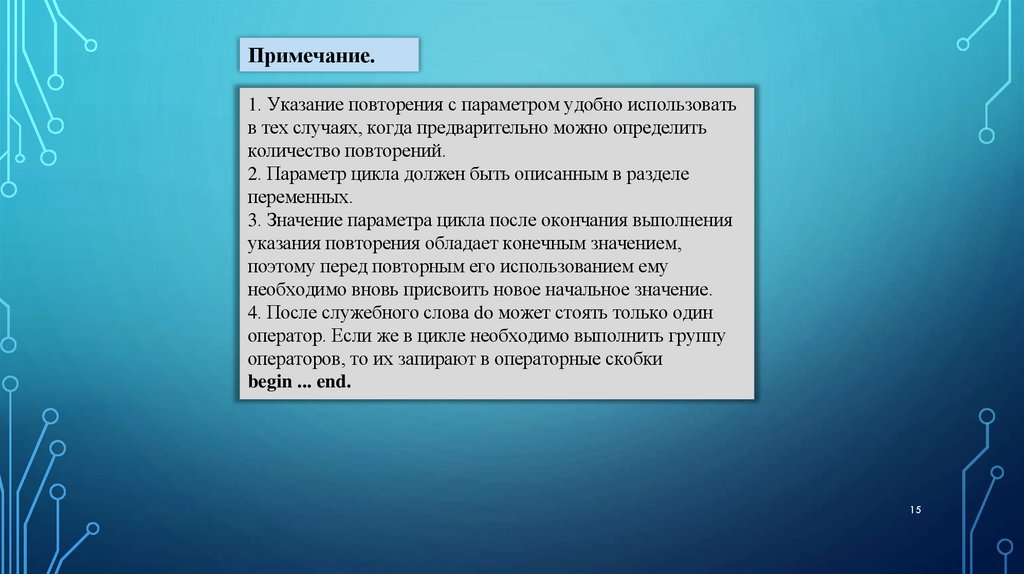 Операторные скобки Begin…End ставятся в том случае, если тело цикла содержит более одного