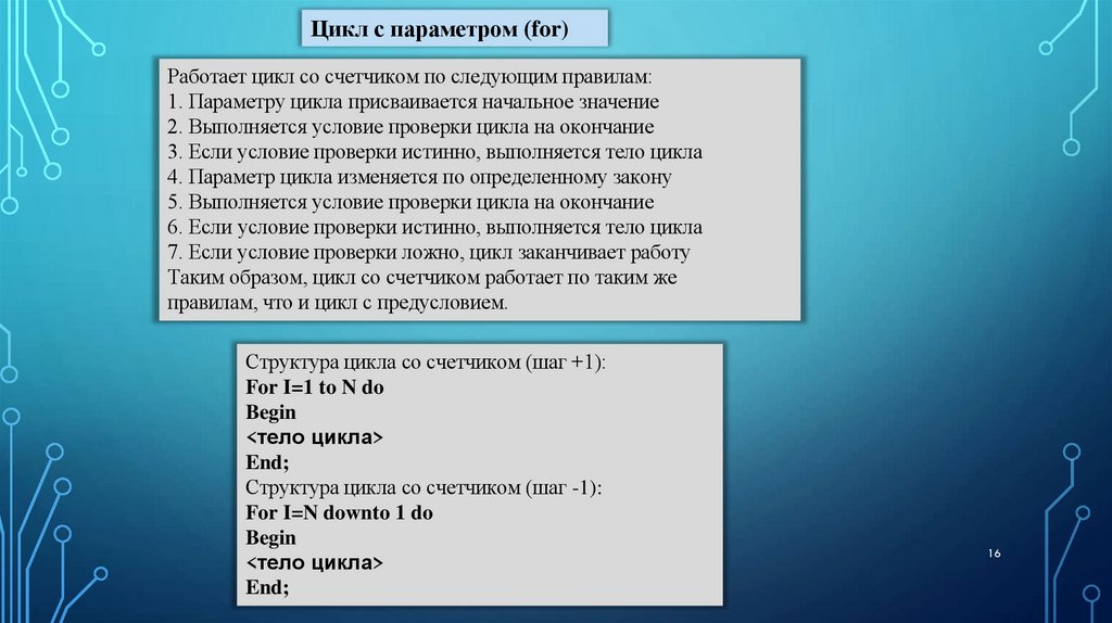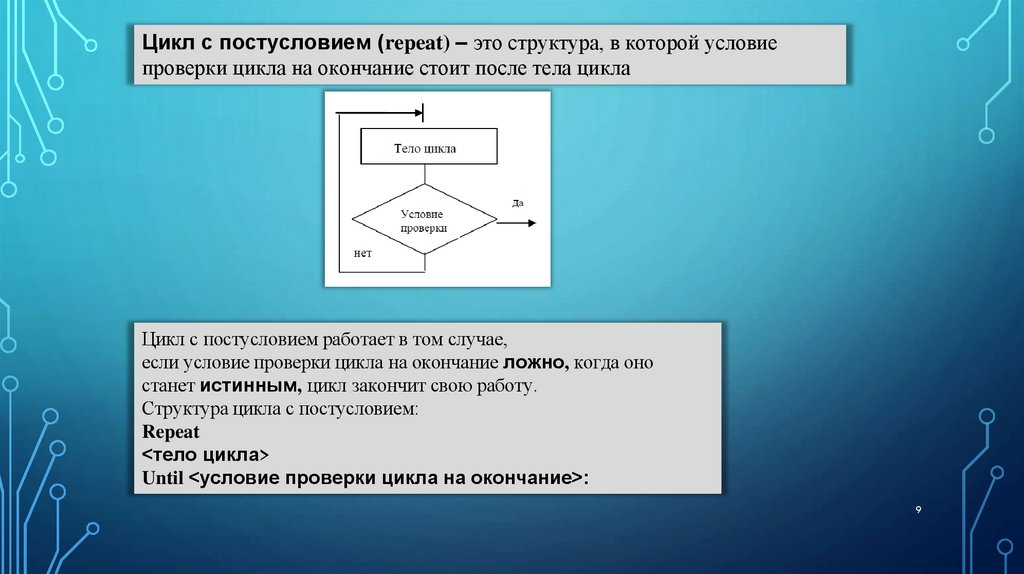 параметром цикла. Во избежание зацикливания, т.е. бесконечной работы цикла, параметр цикла должен изменяться по определенному закону. В Паскале возможна организация трех структур циклов: с предусловием (while), с постусловием (repeat) и с