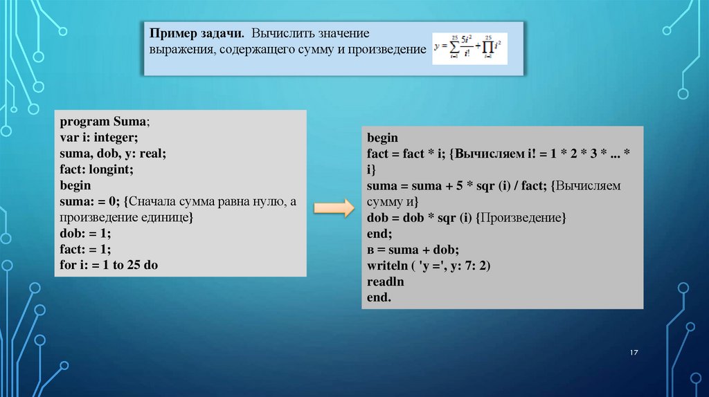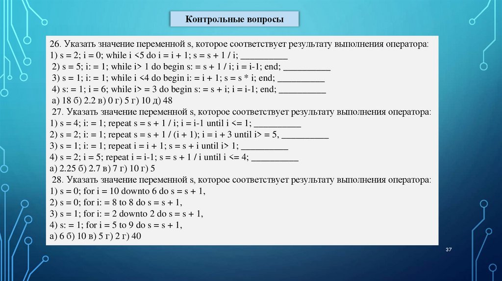 2) s = 5; i: = 1; while i> 1 do begin s: = s + 1 / i; i = i-1; end; __________