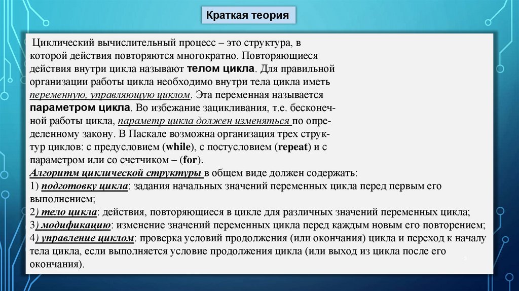 Краткая теорияЦиклический вычислительный процесс – это структура, в