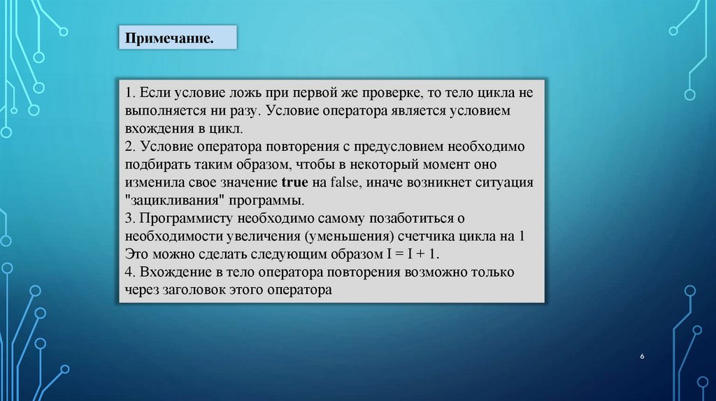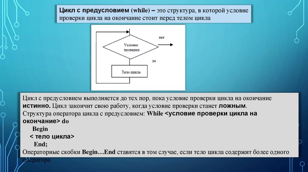 Цикл с предусловием выполняется до тех пор, пока условие проверки цикла на окончание