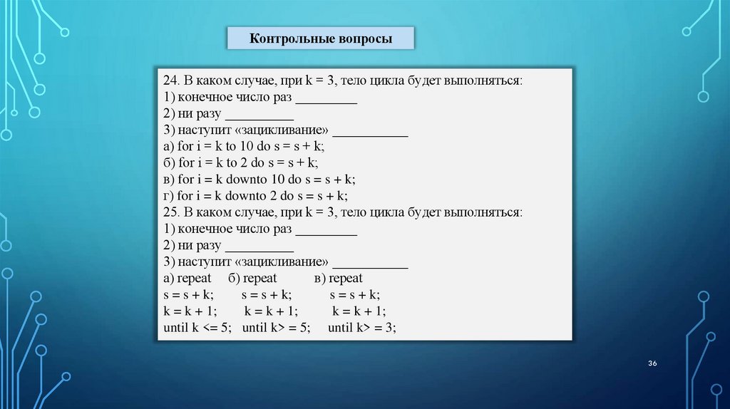 Контрольные вопросы24. В каком случае, при k = 3, тело цикла будет выполняться: