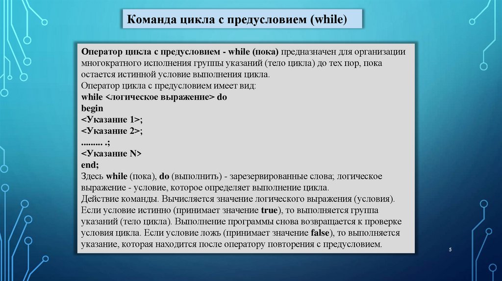 Команда цикла с предусловием (while)Оператор цикла с предусловием - while (пока) предназначен для организации