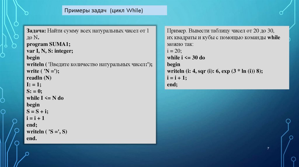 Примеры задач (цикл While)Задача: Найти сумму всех натуральных чисел от 1