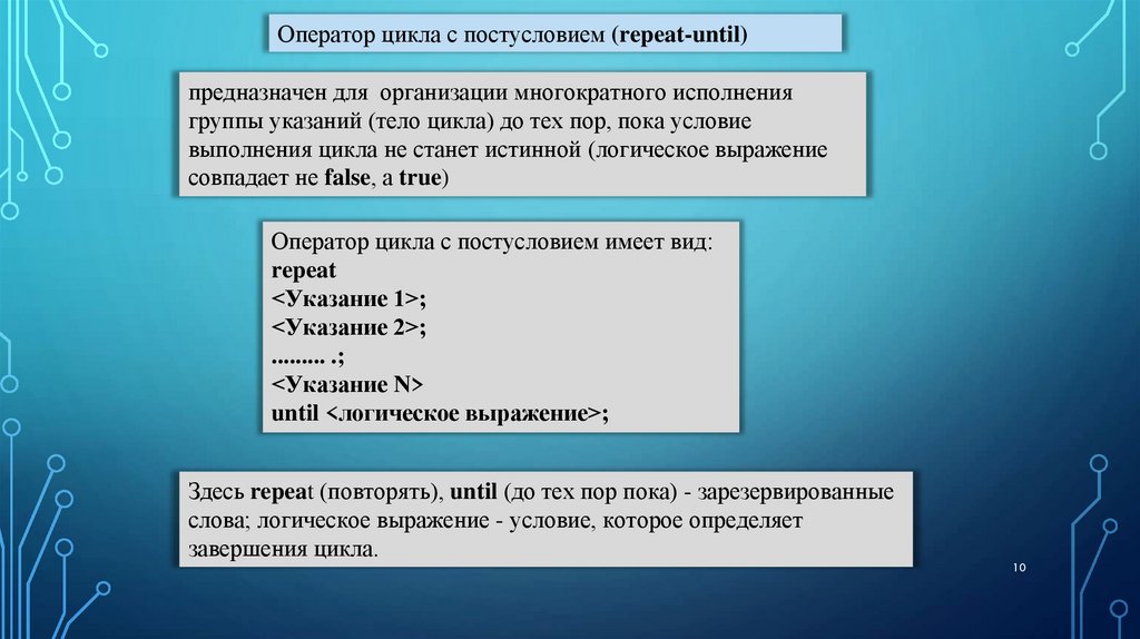 многократного исполнения группы указаний (тело цикла) до тех пор, пока