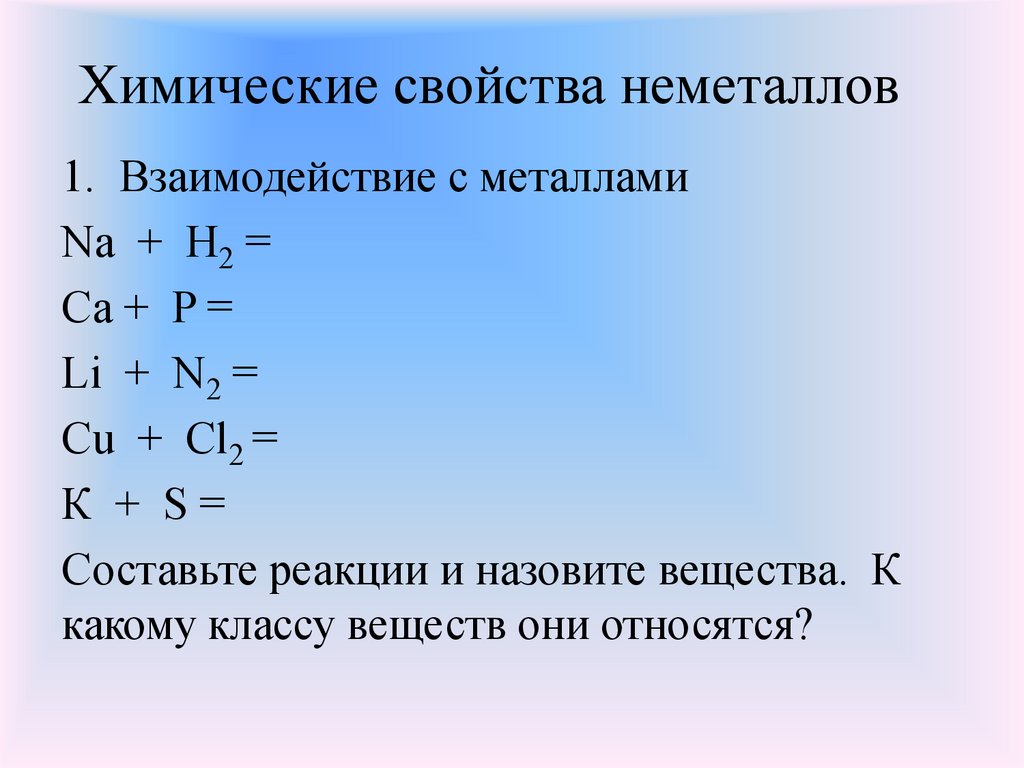 Химические свойства неметаллов1. Взаимодействие с металлами
