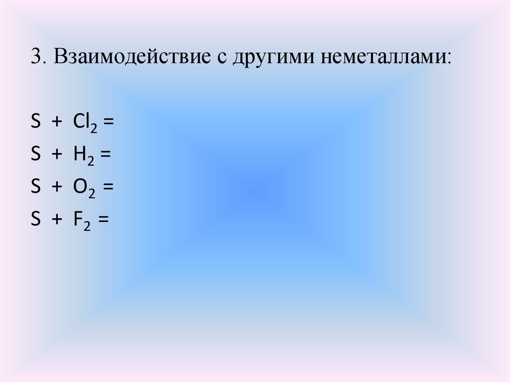 3. Взаимодействие с другими неметаллами:S + Cl2 =