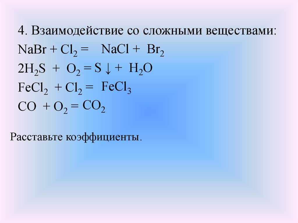 4. Взаимодействие со сложными веществами:NaBr + Cl2 = NaCl + Br2