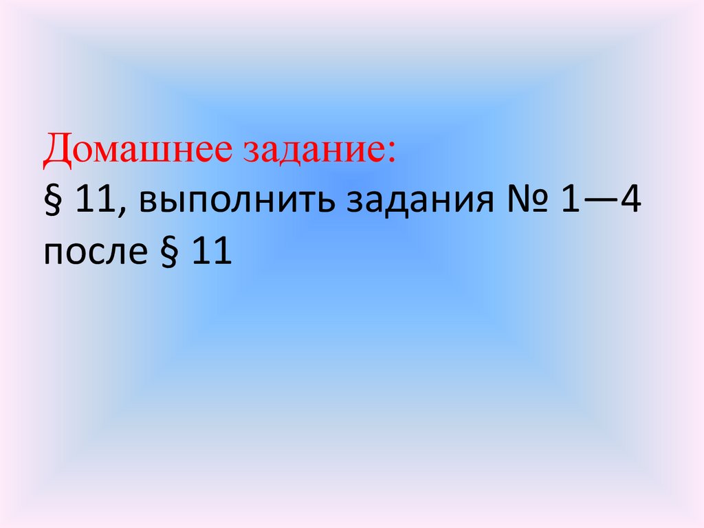 Домашнее задание:§ 11, выполнить задания № 1—4