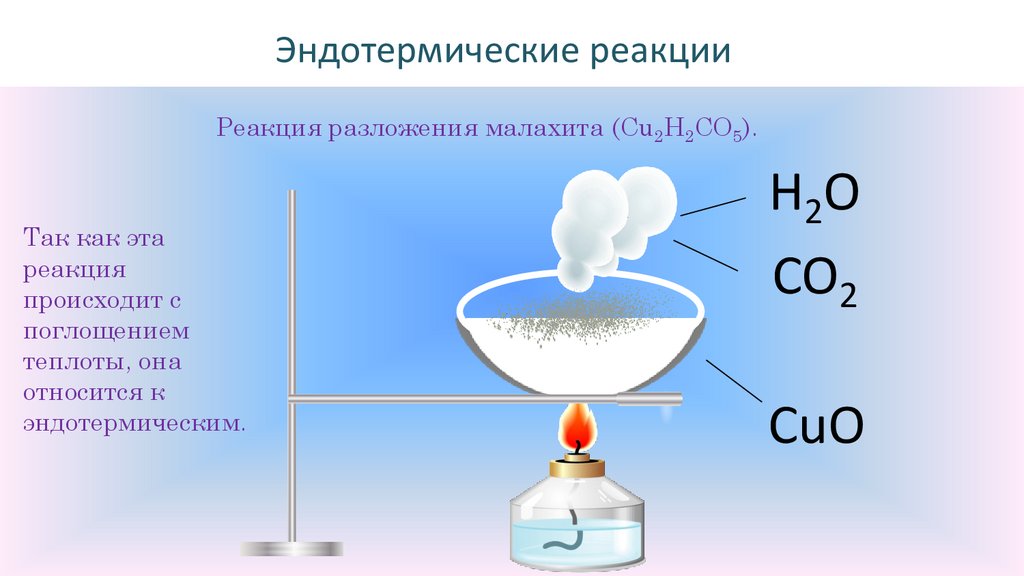 Эндотермические реакцииРеакция разложения малахита (Cu2H2CO5).