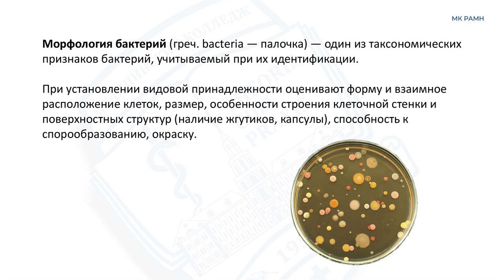 Морфология бактерий (греч. bacteria — палочка) — один из таксономическихпризнаков бактерий, учитываемый при их идентификации.