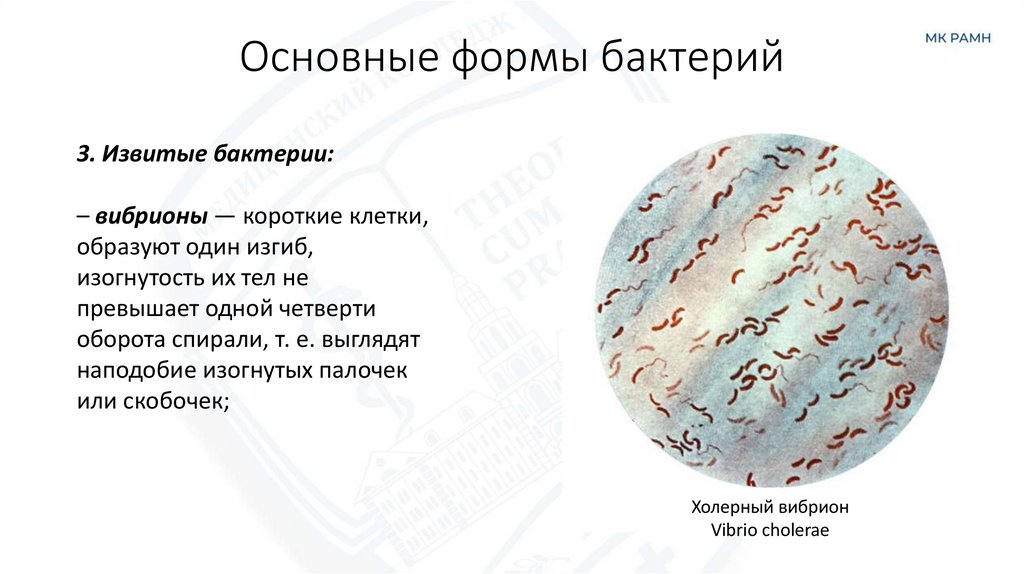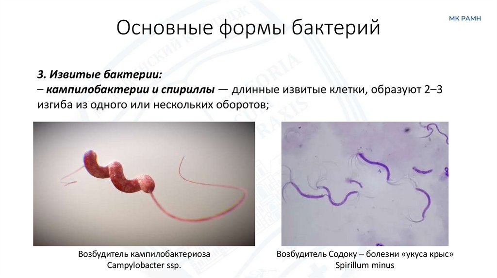 – кампилобактерии и спириллы — длинные извитые клетки, образуют 2–3