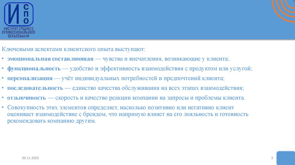 Ключевыми аспектами клиентского опыта выступают:• эмоциональная составляющая — чувства и впечатления, возникающие у клиента;