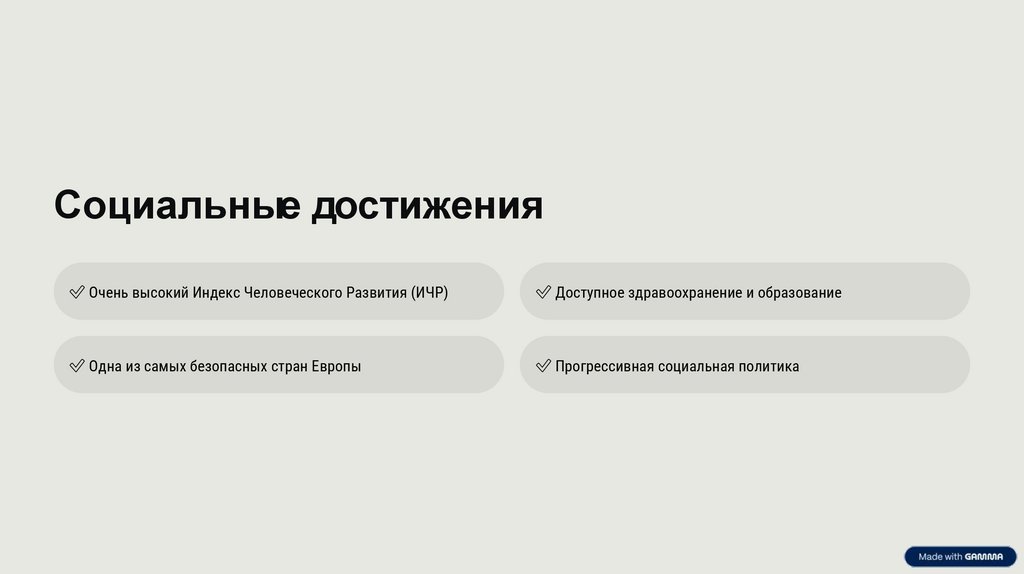 Социальные достижения✅ Очень высокий Индекс Человеческого Развития (ИЧР)