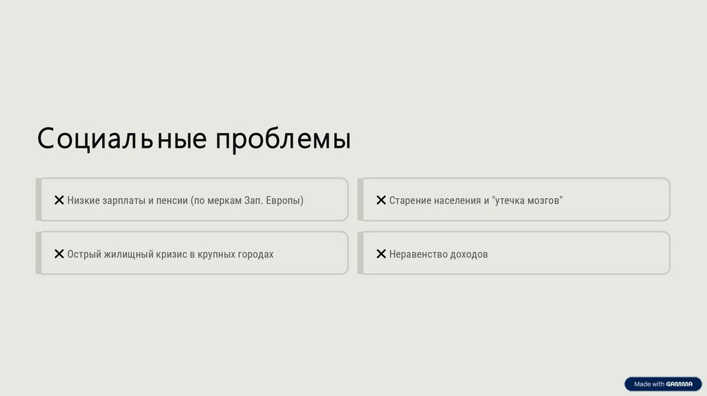 Социал ь ные проблемы❌ Низкие зарплаты и пенсии (по меркам Зап. Европы)