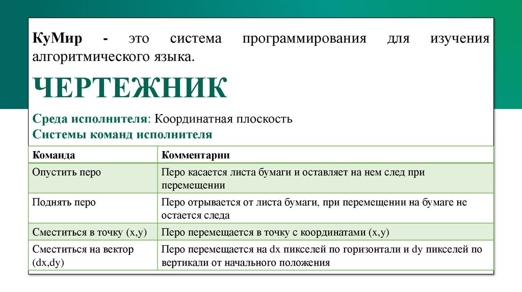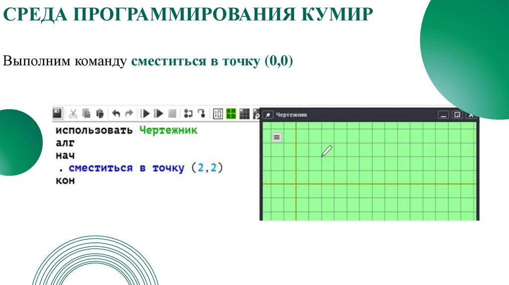 СРЕДА ПРОГРАММИРОВАНИЯ КУМИРВыполним команду сместиться в точку (0,0)