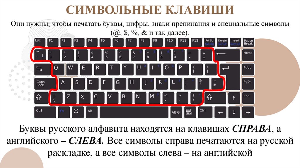 СИМВОЛЬНЫЕ КЛАВИШИОни нужны, чтобы печатать буквы, цифры, знаки препинания и специальные символы