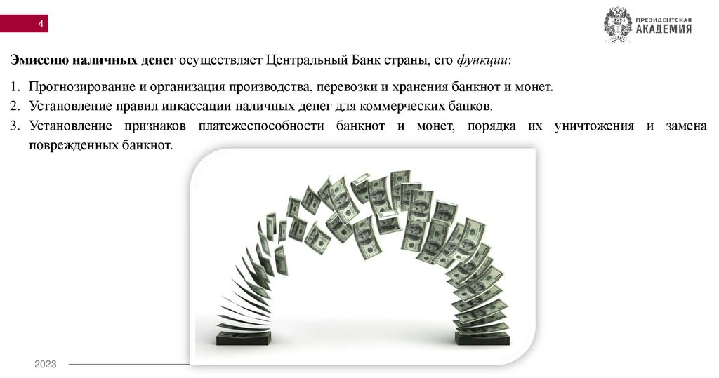4Эмиссию наличных денег осуществляет Центральный Банк страны, его функции: