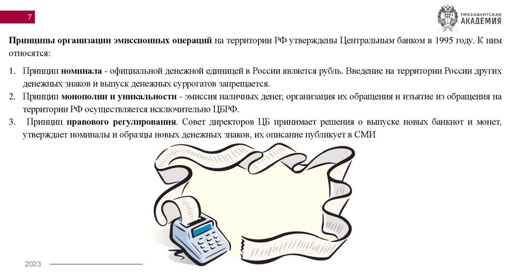 7Принципы организации эмиссионных операций на территории РФ утверждены Центральным банком в 1995 году. К ним