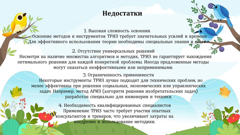 Освоение методов и инструментов ТРИЗ требует значительных усилий и времени.