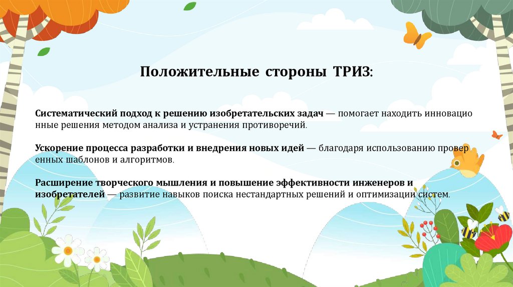 Положительные стороны ТРИЗ:Систематический подход к решению изобретательских задач — помогает находить инновацио