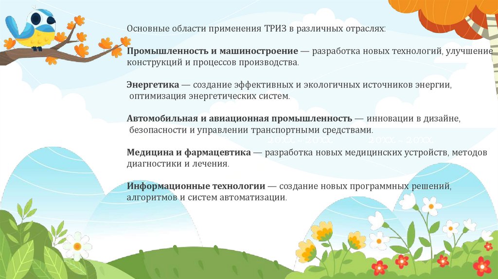 Основные области применения ТРИЗ в различных отраслях:Промышленность и машиностроение — разработка новых технологий, улучшение