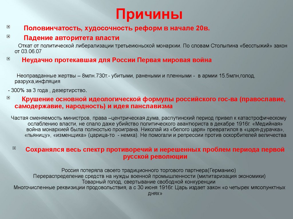 ПричиныПоловинчатость, худосочность реформ в начале 20в.