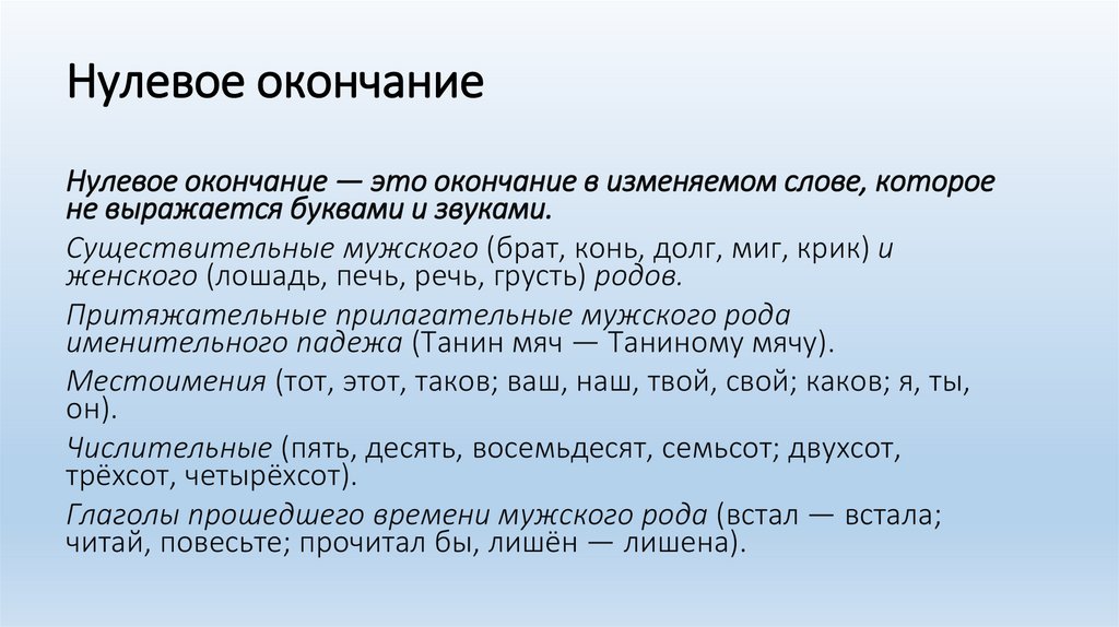 Нулевое окончаниеНулевое окончание — это окончание в изменяемом слове, которое