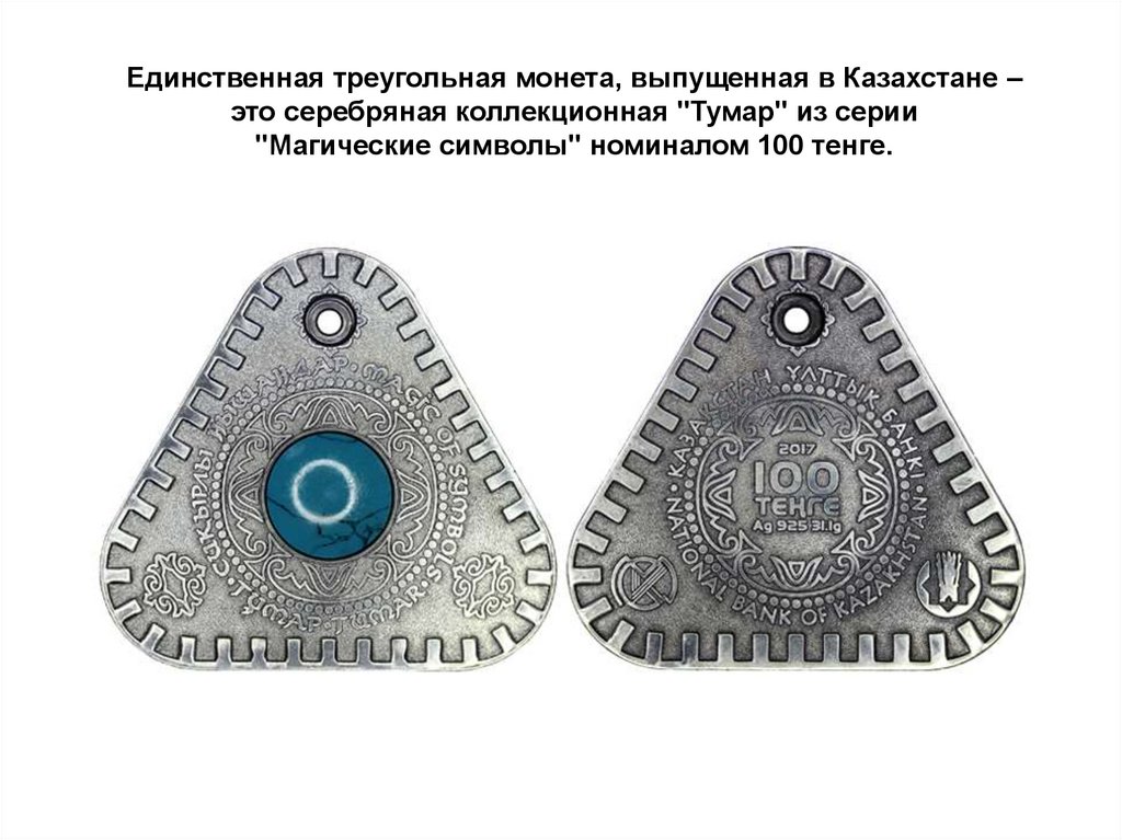 Единственная треугольная монета, выпущенная в Казахстане –это серебряная коллекционная "Тумар" из серии