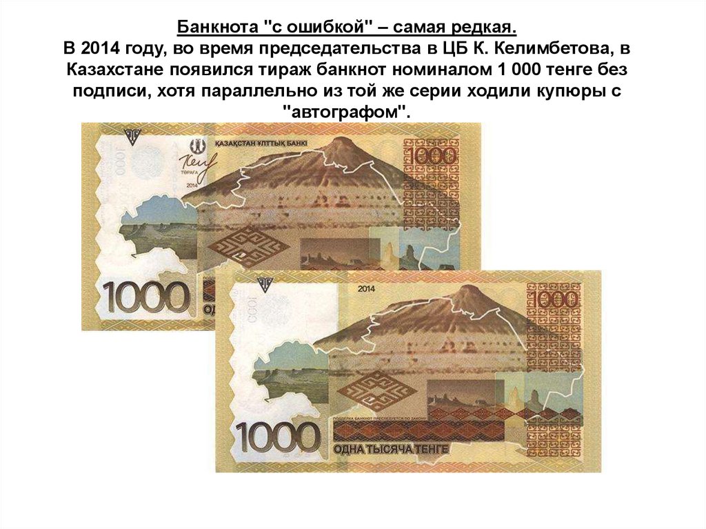 Банкнота "с ошибкой" – самая редкая.В 2014 году, во время председательства в ЦБ К. Келимбетова, в