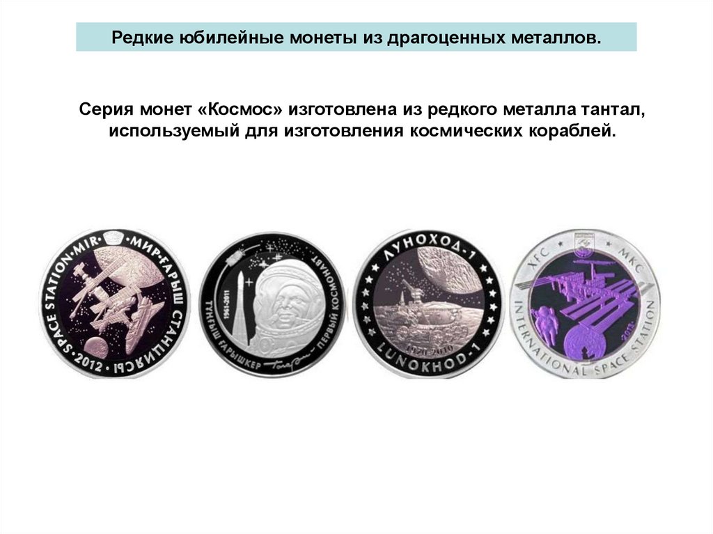 Редкие юбилейные монеты из драгоценных металлов.Серия монет «Космос» изготовлена из редкого металла тантал,