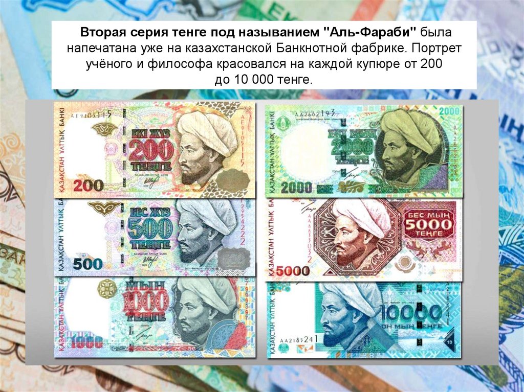 Вторая серия тенге под называнием "Аль-Фараби" быланапечатана уже на казахстанской Банкнотной фабрике. Портрет