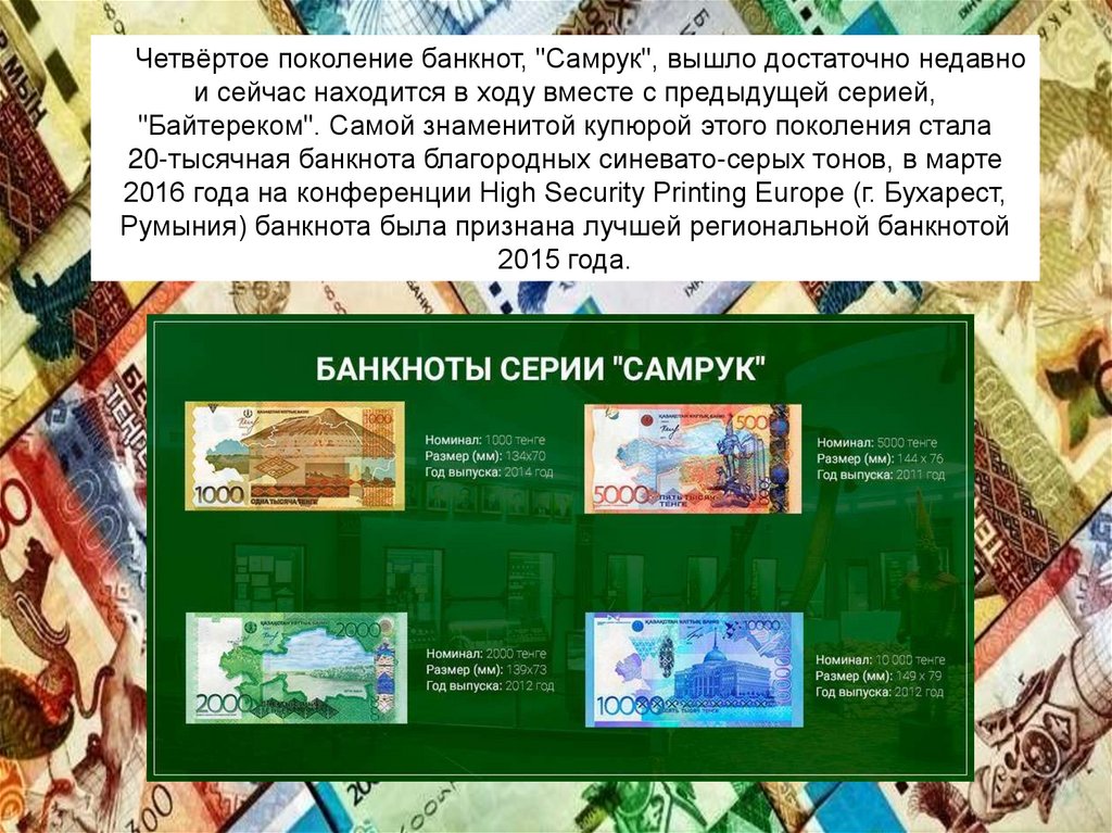 Четвёртое поколение банкнот, "Самрук", вышло достаточно недавнои сейчас находится в ходу вместе с предыдущей серией,