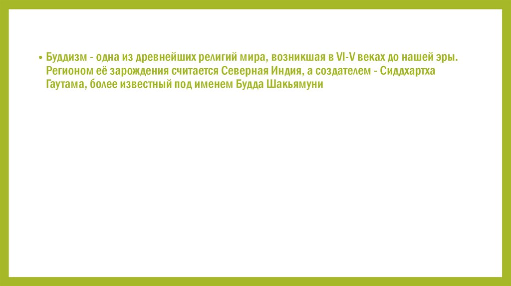 • Буддизм - одна из древнейших религий мира, возникшая в VI-V веках до нашей эры.Регионом её зарождения считается Северная Индия, а создателем - Сиддхартха