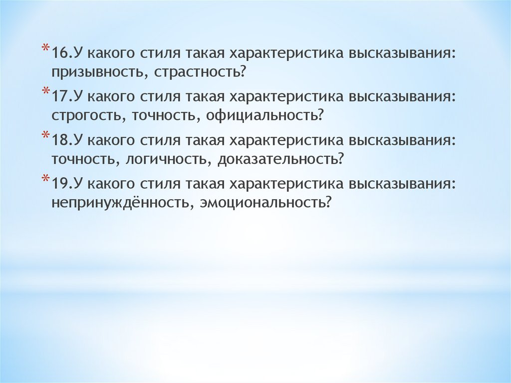 * 16.У какого стиля такая характеристика высказывания:призывность, страстность?