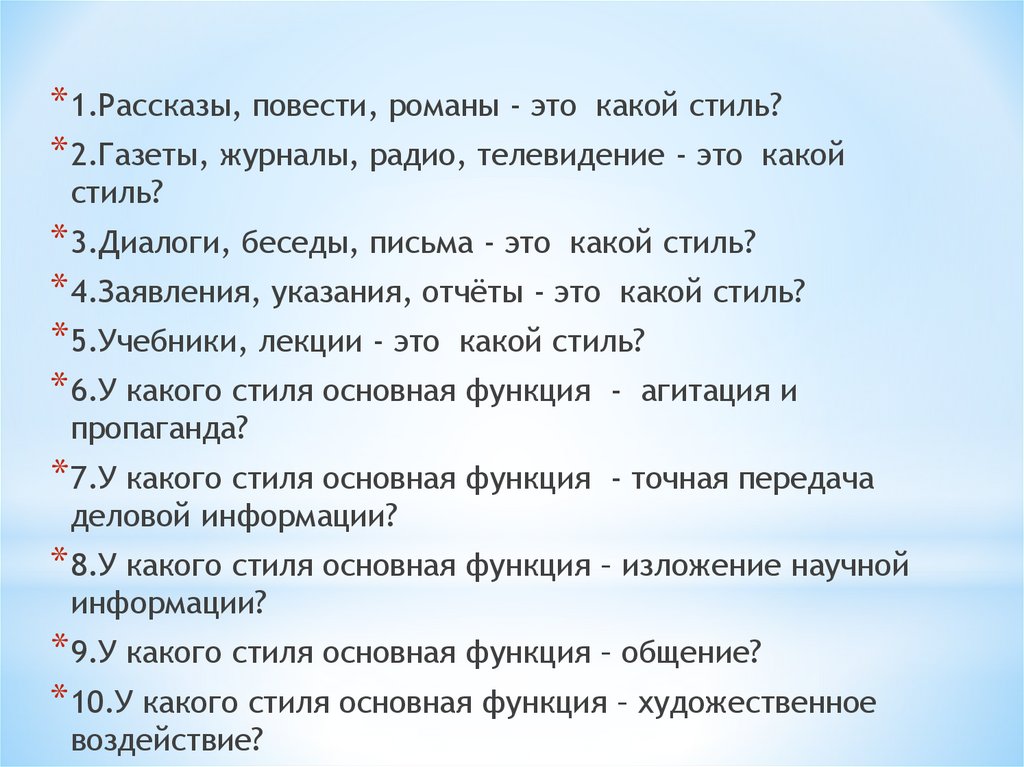 * 1.Рассказы, повести, романы - это какой стиль?* 2.Газеты, журналы, радио, телевидение - это какой