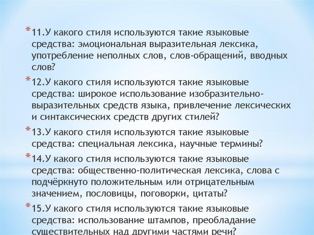 * 11.У какого стиля используются такие языковыесредства: эмоциональная выразительная лексика,