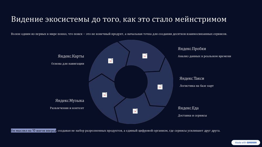 Видение экосистемы до того, как это стало мейнстримомВолож одним из первых в мире понял, что поиск — это не конечный продукт, а начальная точка для создания десятков взаимосвязанных сервисов.