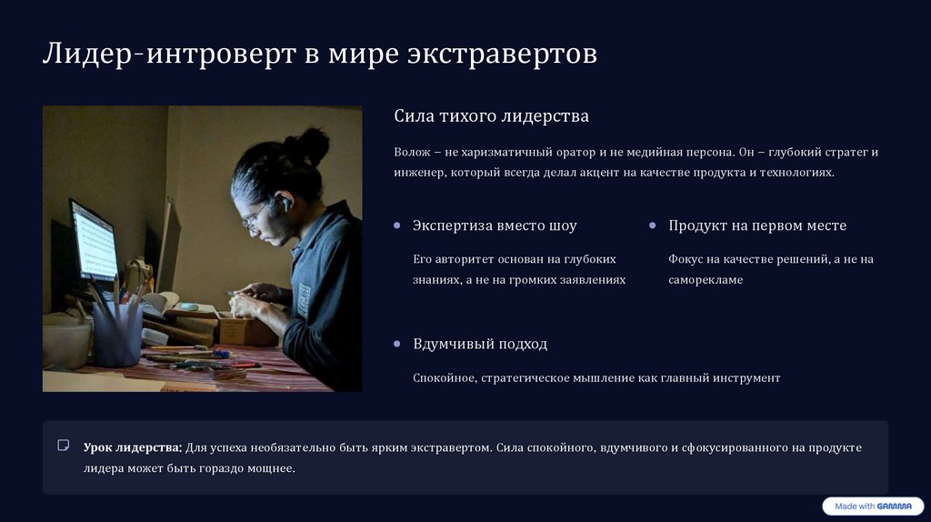 Урок лидерства: Для успеха необязательно быть ярким экстравертом. Сила спокойного, вдумчивого и сфокусированного на продукте
