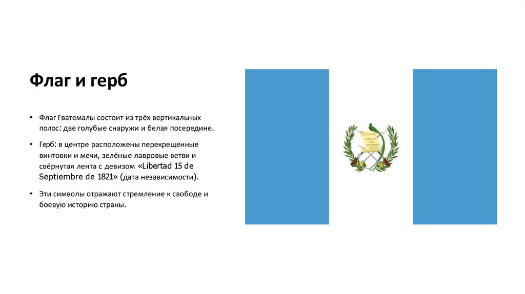 Флаг и герб• Флаг Гватемалы состоит из трёх вертикальных
