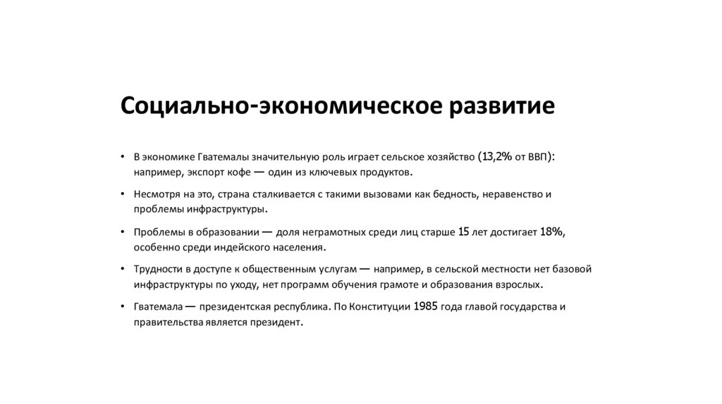 Социально-экономическое развитие• В экономике Гватемалы значительную роль играет сельское хозяйство (13,2% от ВВП):