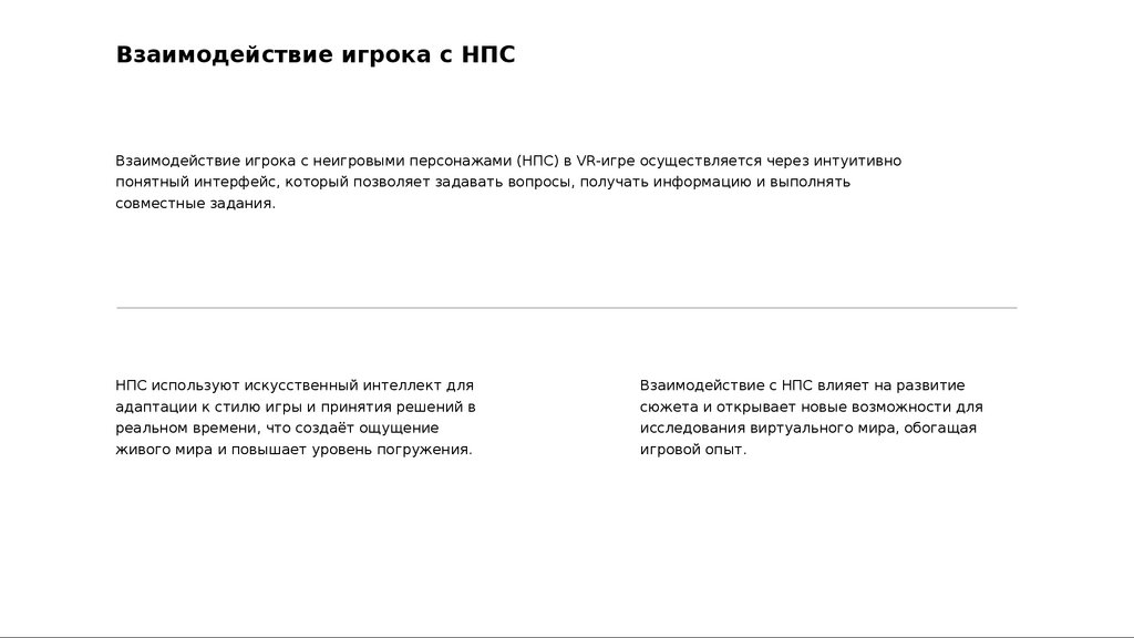 Взаимодействие игрока с НПСВзаимодействие игрока с неигровыми персонажами (НПС) в VR-игре осуществляется через интуитивно