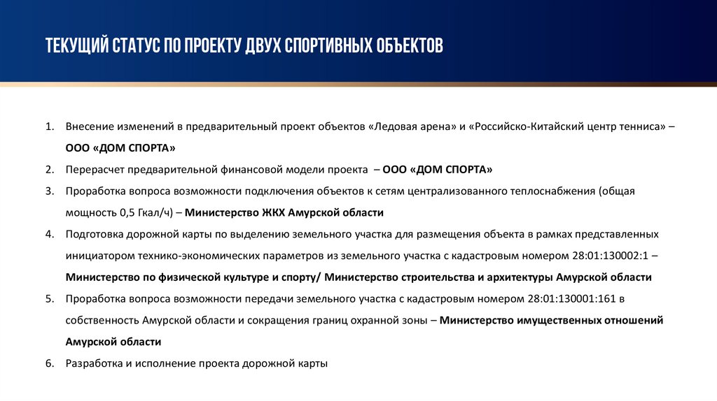 Текущий статус по ПРОЕКТУ ДВУХ СПОРТИВНЫХ ОБЪЕКТОВ1. Внесение изменений в предварительный проект объектов «Ледовая арена» и «Российско-Китайский центр тенниса» –